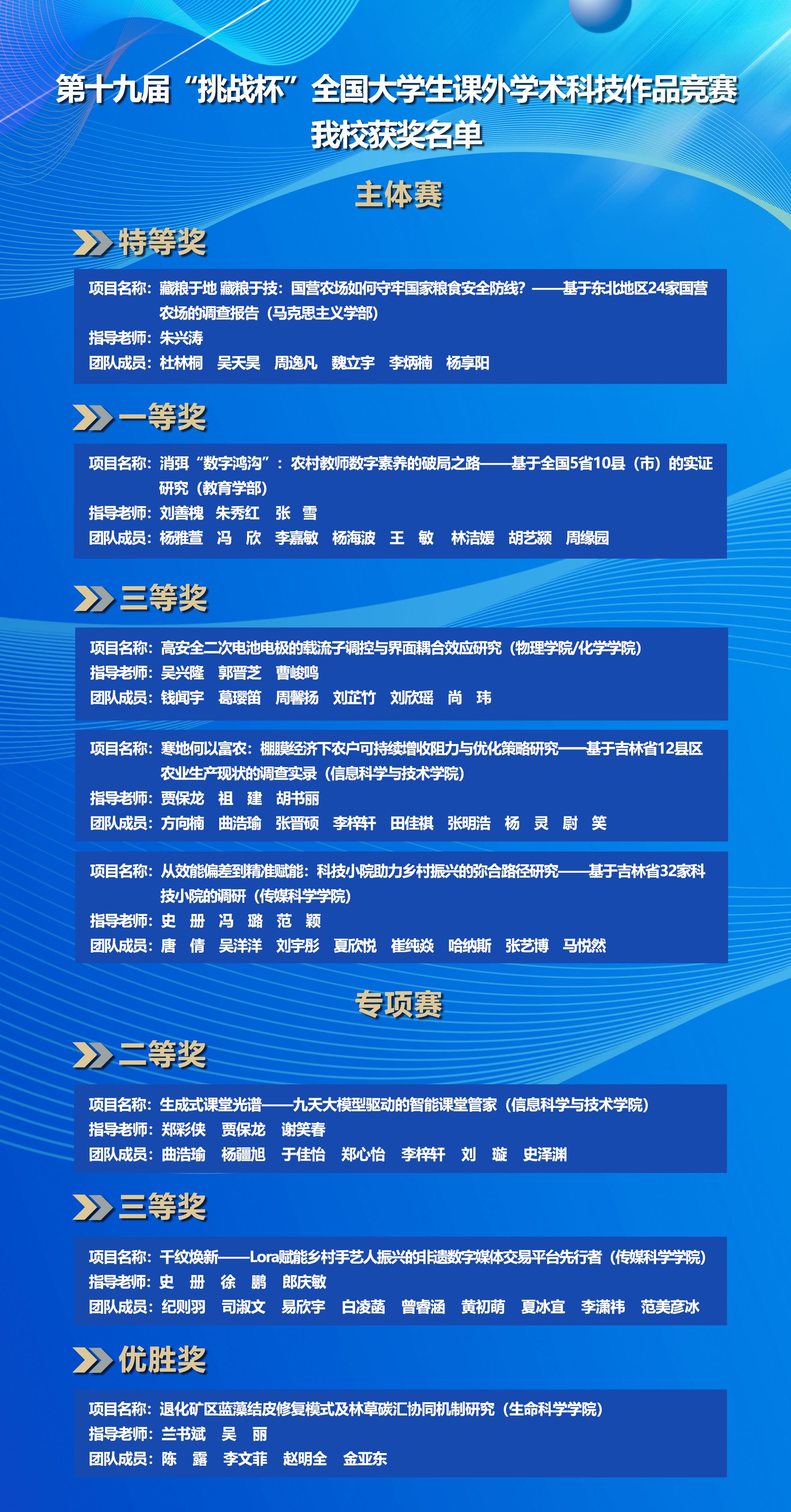 本次竞赛,我校共有8支团队进入全国决赛,获主体赛特等奖1项、一等奖1项、三等奖3项,“人工智能+”专项赛二等奖1项、三等奖1项,“揭榜挂帅”专项赛优胜奖1项,获奖数量、质量和赛事总积分均创我校历史最佳成绩。其中,马克思主义学部参赛项目《藏粮于地 藏粮于技:国营农场如何守牢国家粮食安全防线?》获主体赛特等奖,这是我校继2005年、2009年后,第三次荣获“挑战杯”全国大学生课外学术科技作品竞赛特等奖。该项目由朱兴涛副教授指导,杜林桐、吴天昊、周逸凡、魏立宇、李炳楠、杨享阳等同学共同完成。团队师生历时三年,深入东北三省一区24家国营农场开展实地跟踪调研,深耕钻研、久久为功,形成调研材料逾百万字,是斩获大赛最高奖项的关键所在。